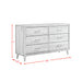 The Malibu 6-Drawer Dresser in Walnut is a stunning addition to any bedroom. It features solid wood framing and mid-century style tapered legs for a sleek look. The metal handles add a modern touch, while the top drawers are lined with black felt for a luxurious feel. With dust-proofing on the bottom layer and kenlin drawer guides, this dresser is not only stylish but also highly functional. An anti-tipping kit is included for safety and peace of mind. Add a touch of mid-century elegance to your bedroom with this piece from the Malibu collection. Features: • Solid Wood Framing • Mid-Century Style Tapered Legs • Metal Handles • Top Drawers with Black Felt • Dust-Proofing Bottom Layer • Kenlin Drawer Guides • Anti-Tipping Kit Included • 60"W x 18"D x 35"H • Due to lighting, product color may slightly vary from images. Dimensions: Depth: 18.0" x Width: 60.0" x Height: 35.0" Weight: 138.0 lbs.
